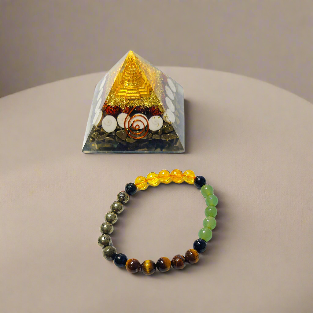 This powerful combo of the Money Magnet Pyramid and Money Magnet Bracelet is a divine combination designed to attract wealth, success, and positive energy into your life.